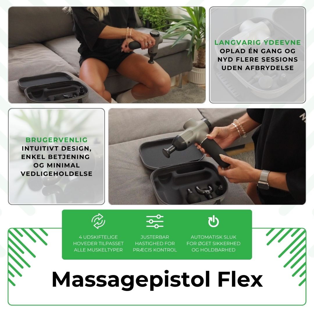 • Massagepistol Flex er et banebrydende massageredskab udstyret med fire udskiftelige hoveder tilpasset forskellige muskelgrupper. Uanset om du skal behandle store muskelgrupper, dybe væv, eller bare ønsker en afslappende massage, har Massagepistolen et hoved, der passer til dine behov.